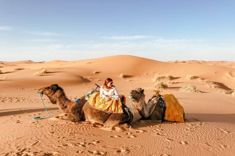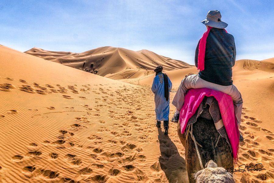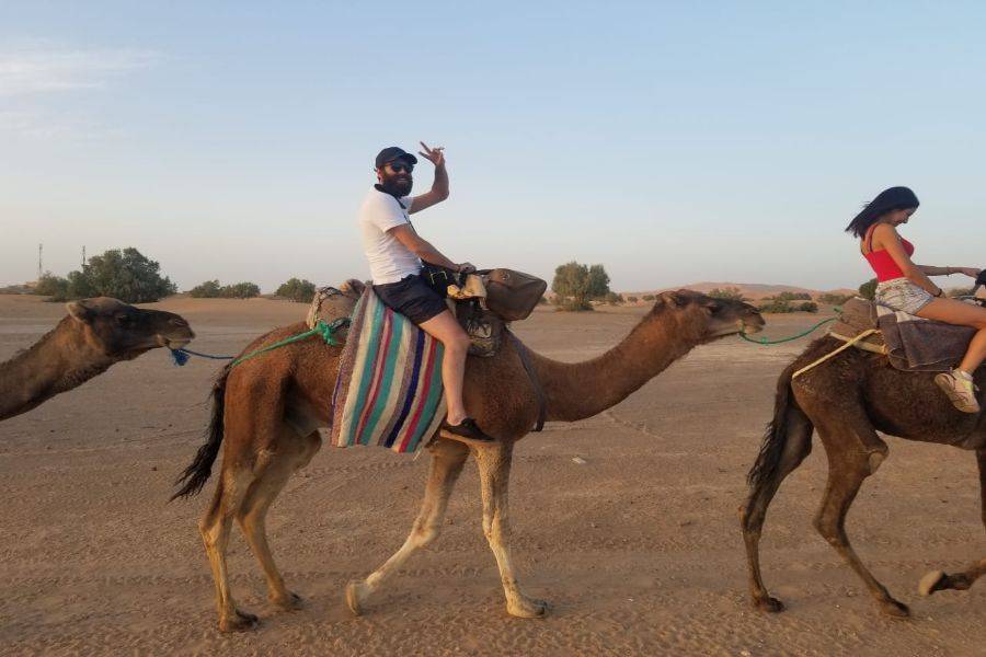 En quittant Errachidia et en traversant un paysage fascinant, nous passerons par une large terre et une route splendide avec beaucoup de palmiers Oasis. En passant par Aoufouss puis Erfoud pour voir les différents types de montagnes qui semblent très différentes de celles que vous avez vues au Maroc. Nous atteindrons Errissani, une ville belle et accueillante où nous visiterons Moulay Ali Cherif, qui est un mausolée avec un jardin calme et magnifique. Notre dernier arrêt le premier jour sera Merzouga, montez à dos de chameau pour vous diriger vers les dunes de l'Erg Chebbi et rencontrez les nomades locaux avec un excellent accueil, profitez de la nuit avec un beau paysage d'instruments nomades traditionnels et de danse. Ensuite, passez une nuit merveilleuse sous le ciel bleu foncé dans le vaste désert marocain.
