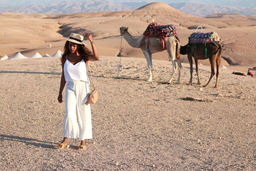 • Belle balade à dos de chameau avec le coucher du soleil dans le magnifique désert rocheux d'Agafay